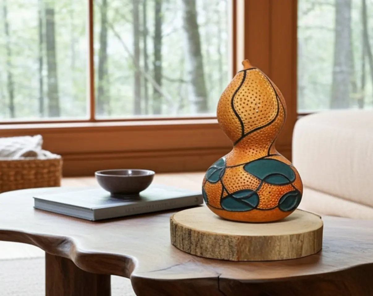 Lámpara ambiental de producción artesanal hecha de calabaza. Buscando una producción sostenible y ecológica esta lámpara ha sido elaborada artesanalmente con una calabaza cultivada propiamente y una lamina de madera, por lo que es una lámpara muy propicia para todo los que amáis la decoración natural.