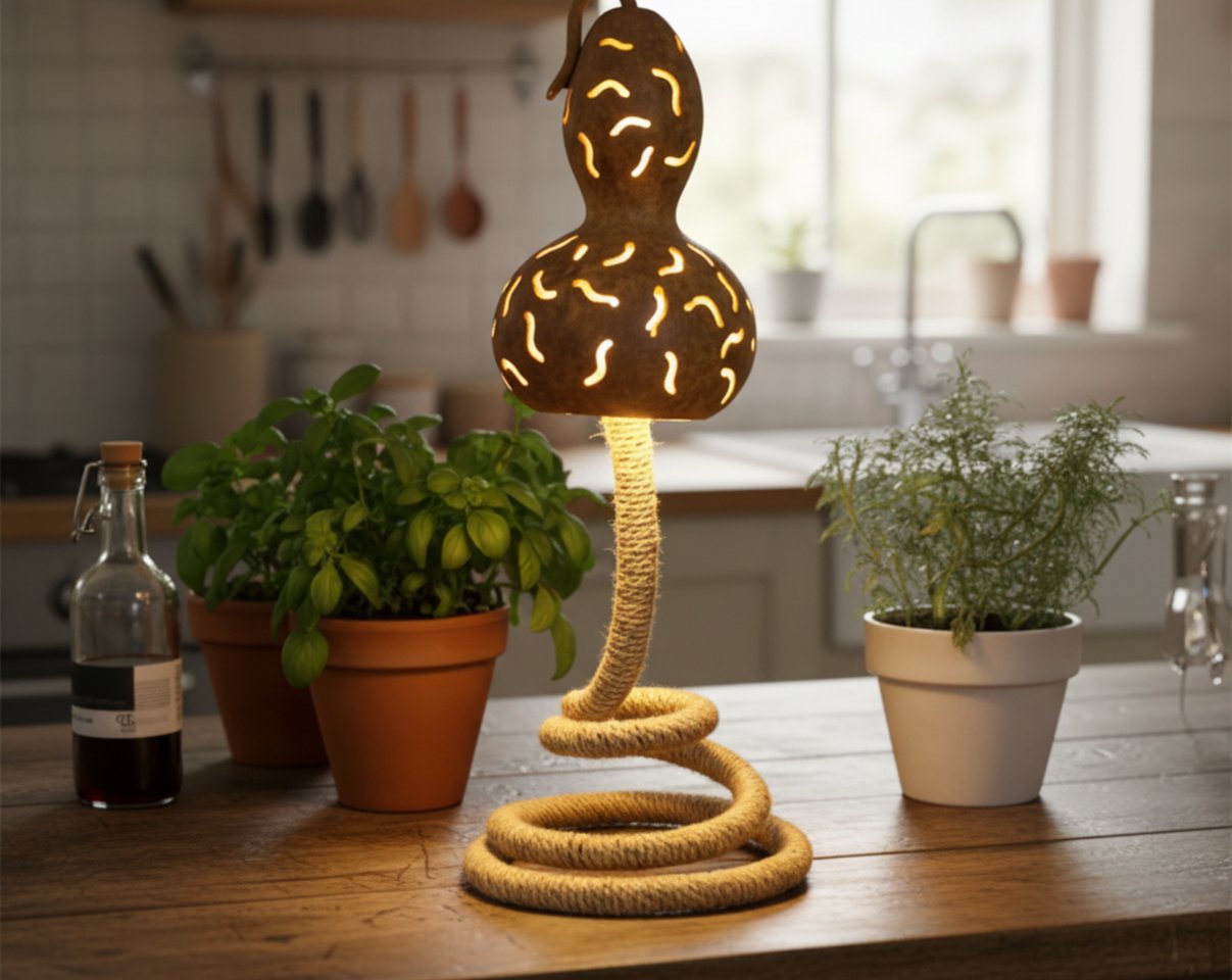 Lámpara rustica de mesilla hecha con una calabaza natural y una base flexible de cuerda