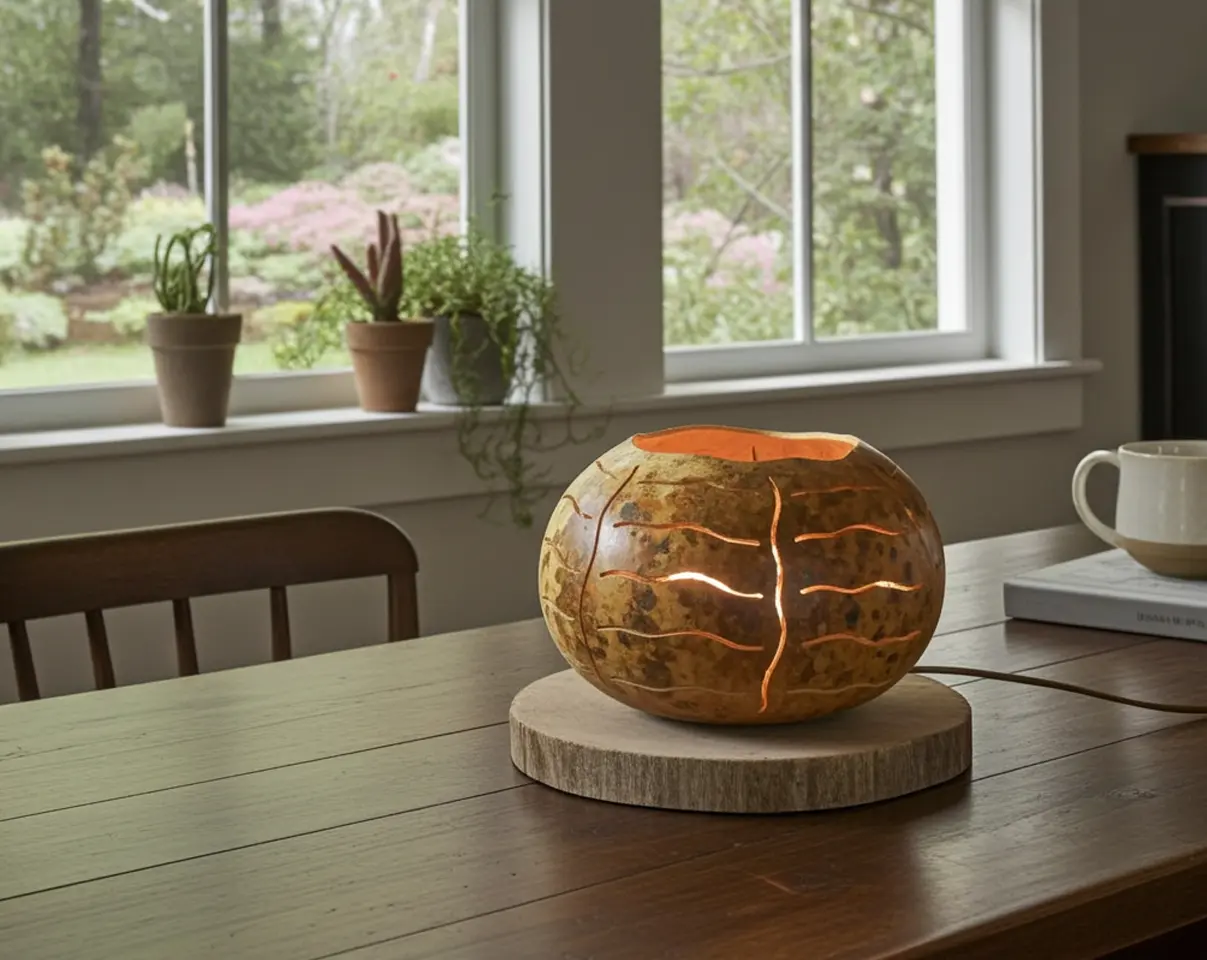 En la parte superior de la calabaza, Kuia realizó una abertura para que la luz se proyectara hacia el techo de forma indirecta. La luz creaba un entorno agradable con una iluminación óptima, ideal para relajarse antes de dormir o para crear un ambiente acogedor en la habitación.