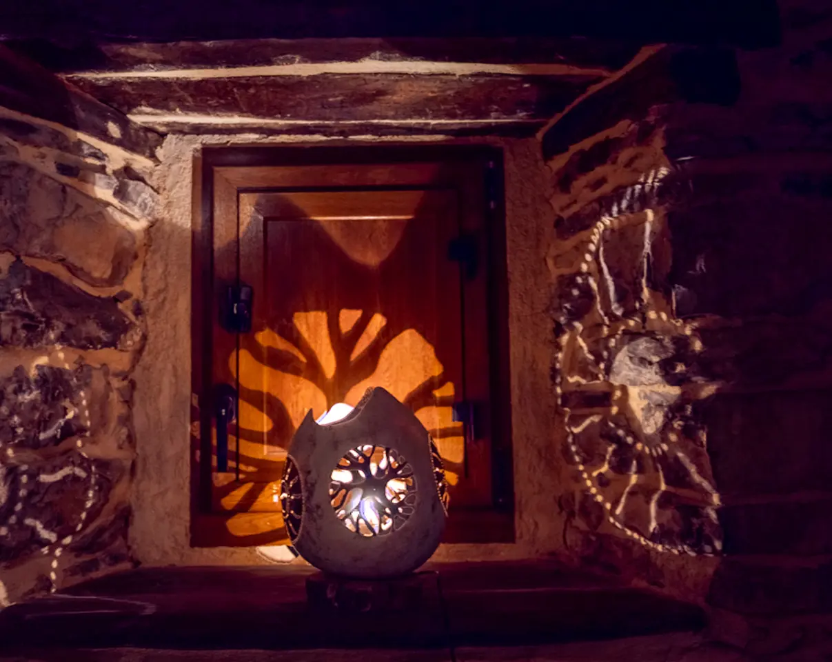 Al encender la lámpara, la habitación se transformaba en un espectáculo de luces y sombras. La luz cálida y tenue se filtraba a través de los tallados de la calabaza, creando un juego hipnótico que simulaba las ramas del árbol. Las formas se proyectaban en las paredes, creando un lienzo mágico.