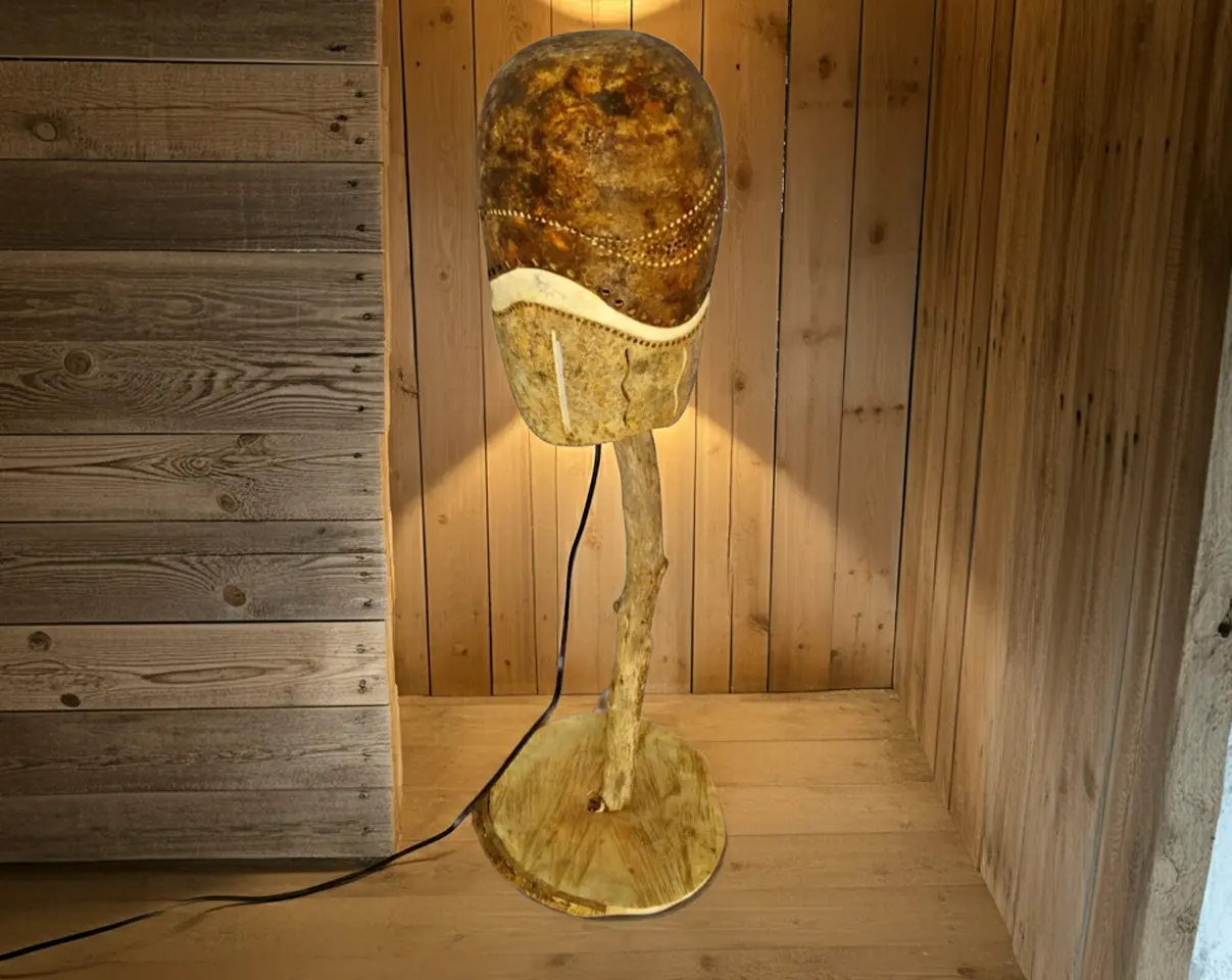 Materiales 100% naturales: La lámpara está elaborada con materiales naturales de la más alta calidad. La madera, seleccionada y cortada por nosotros mismos, se combina con una rama de árbol, generalmente de roble o haya, y una calabaza cuidadosamente elegida para armonizar con el conjunto.